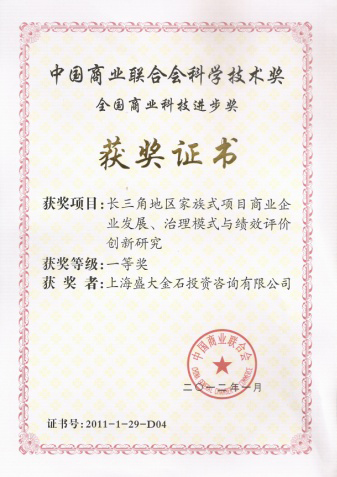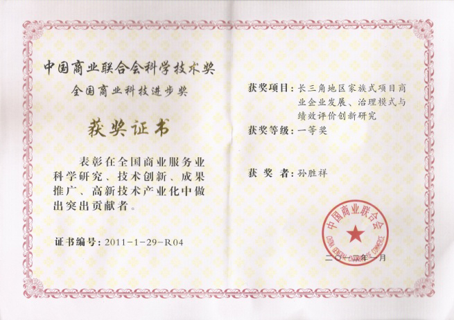 盛大金石研究項目《長三角地區(qū)家族式項目商業(yè)企業(yè)發(fā)展、治理模式與績效評價創(chuàng)新研究》,獲得一等獎(第29項)。